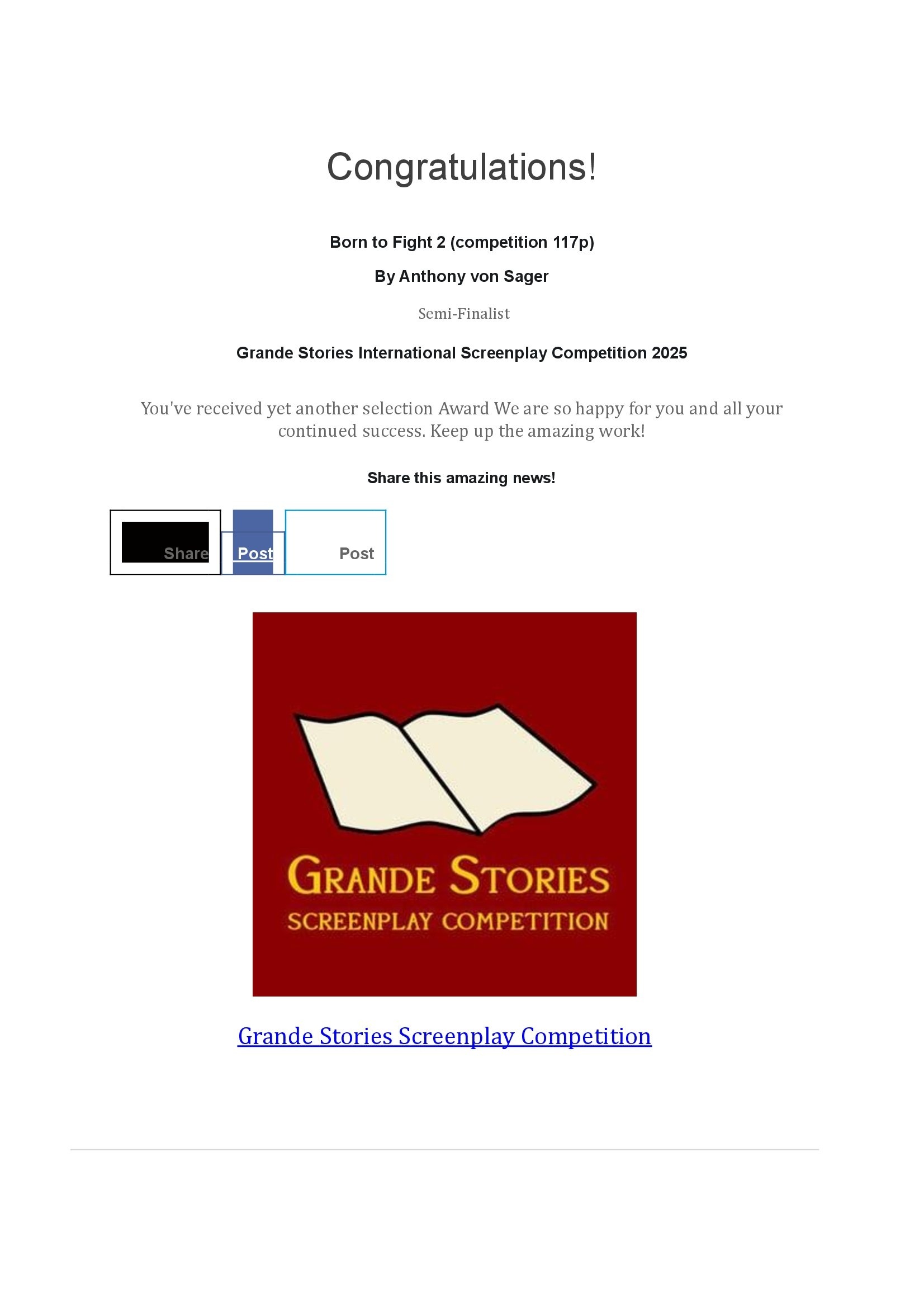 Already 2004 "Born to Fight" (screenplay version of Novel Eyes in Darkness) written by Master Anthony von Sager under top 5% @ Sundance Film Festival Screenplay Competition, in 2009 (semi-Finalist) and 2011 a great 4th place at Beverly Hills Film Festival, (Screenplay Contest 2011), semi-Finalist Vail Screenplays Contest 2024, a great Semi-finalist @ Santa Barbara Screenplay Awards 2024, also Quater-Finalist @ LA Screenplay Awards 2024, and Grand Stories Awards Semi-finalist 2025 and counting 😀😃..